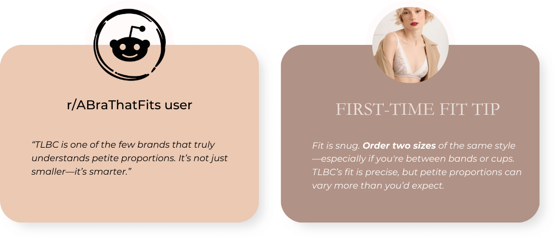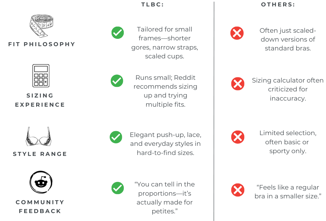 Not all petite bras are created equal. This chart breaks down how The Little Bra Company compares to other petite-focused brands—across fit, style range, support, and customer satisfaction. Based on real conversations from Reddit’s petite fashion and lingerie communities, we’ve gathered what women are actually saying about their experiences. See why TLBC consistently leads with thoughtful engineering, elegant design, and a loyal community of women who finally feel seen.